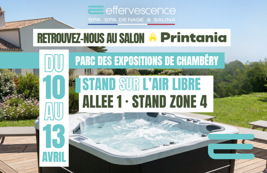 Retrouvez Effervescence Spa & Sauna au Salon Printania, du 10 au 13 avril au Parc des Expositions de Chambéry. Venez découvrir nos solutions bien-être et concrétiser votre projet.